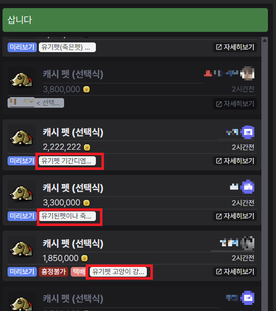 이 때 구매자가 제시하는 구매가격은 일반적으로 새 펫을 구매하는 가격보다 저렴한 경우가 많습니다. 여기서 유기펫의 뜻은, 구매자가 판매자에게 특정 펫을 구매한다고 이야기해서 판매자가 펫을 구매해 왔지만 실제 거래를 하지 않고 도망가는 경우입니다. 예를 들면, 주니어발록 펫을 산다고 해서 구매자가 캐시샵에서 펫을 구매해 오면 거래를 하지 않고 도망가는 건데, 이때 문제는 펫은 착용하지 않아도 구매시점부터 남은 기간이 줄어들기 때문에 펫을 빠르게 팔지 않는다면 사용 가능한 기간이 줄어들거나 30일이 지나면 결국 죽고 맙니다. 특히 비인기펫은 선호하는 사람들이 없어서 제값에 판매하기 어려운 경우가 많습니다. 죽은 펫은 생명의 물 아이템을 사용하면 다시 살려서 사용이 가능하기 때문에 저렴한 가격에 유기펫이나 죽은 펫이 어느 정도 수요는 있는 편입니다.