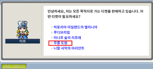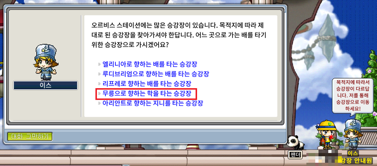 오르비스 매표소에서 우측으로 이동 후 [이스] 에게 말을 걸어 [무릉으로 향하는 학을 타는 승강장] 을 선택합니다.