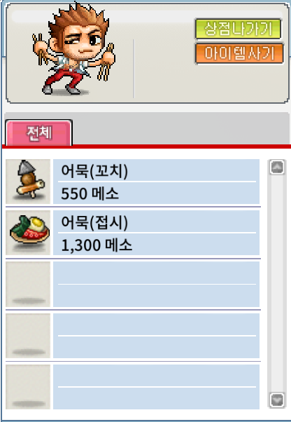 일본 버섯신사 마을의 모습인데, 가판대를 열고 장사를 하고 있는 npc 이미지를 누르면 상점이 열립니다. 각종 버프 음식과 mp, hp를 충전시켜주는 음식은 모두 구매가 가능합니다. 하지만 표도 직업같은 경우 잡화상점에서 표창을 충전해야 사냥을 할 수 있는데, 해당 상인들에게서는 버프, 회복 아이템 구매만 가능하고 표창 충전은 불가능합니다. 따라서 표창 충전을 하기 위해서는 다른 마을로 이동을 해야 합니다.