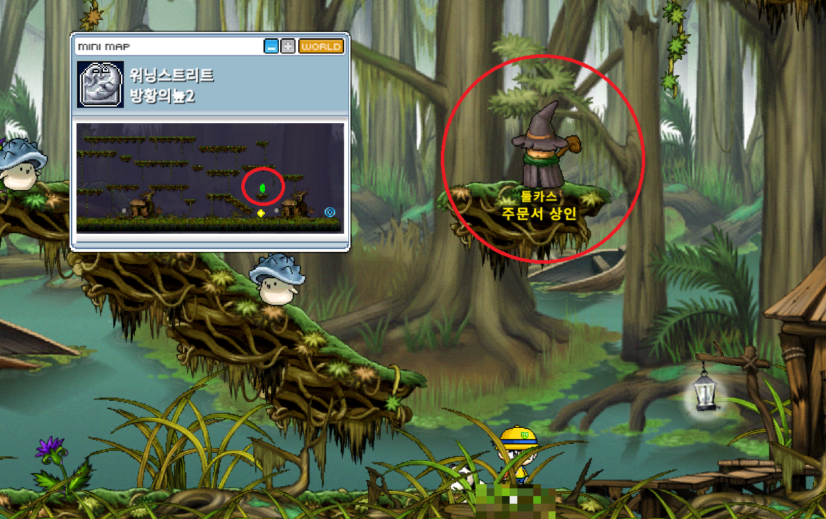 포탈을 타면 워닝스트리트 방황의늪2 로 이동합니다. 조금 더 우측으로 이동 후, 두 번째 나무집에 가기 전 위층 지형에 주문서상인 [툴카스]가 있습니다.