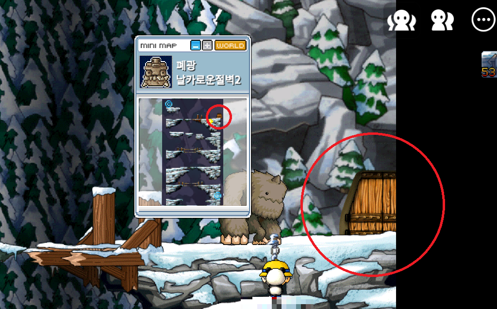 날카로운절벽2 에서 우측 꼭대기로 이동하면 구석에 나무 판자로 된 문이 보입니다. 문 앞에서 히든포탈을 탑니다.