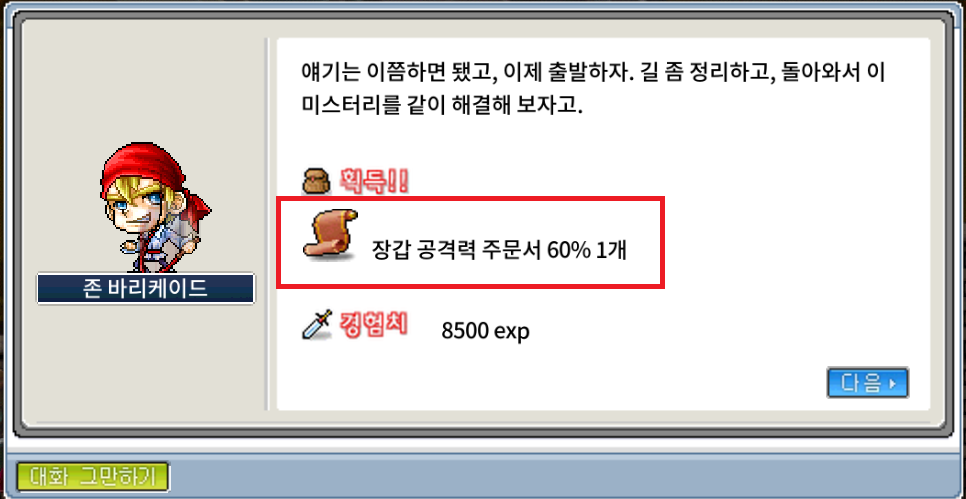 퀘스트를 완료하면 확정 보상으로 장갑 공격력 주문서 60%를 1장 받을 수 있습니다.